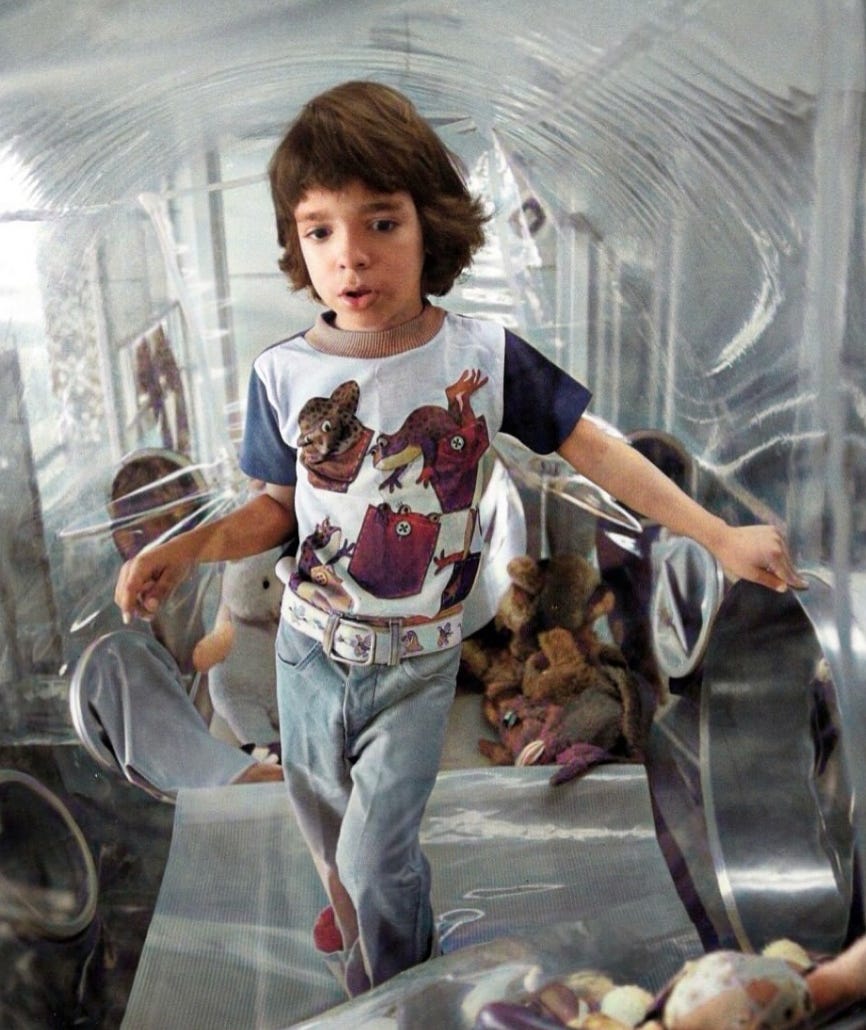 When David was born, he was immediately placed into a two-foot isolator. He was baptised using sterilised holy water and touched only through rubber gloves built into the plastic wall. He couldn’t feel warmth. He couldn’t taste air. But he could see, and as he grew, he could speak. By all accounts, he was bright and articulate, with a vocabulary shaped by a hospital ward.